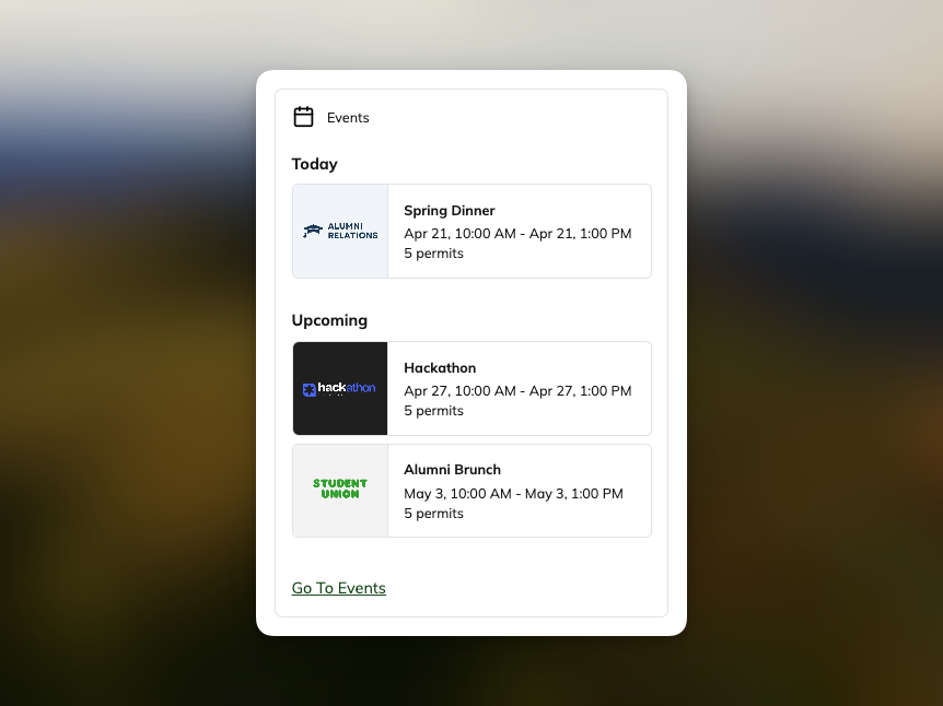 Displays all events that are active today, as well as those starting soon. Users can view registration counts or jump into an event to manage permits.