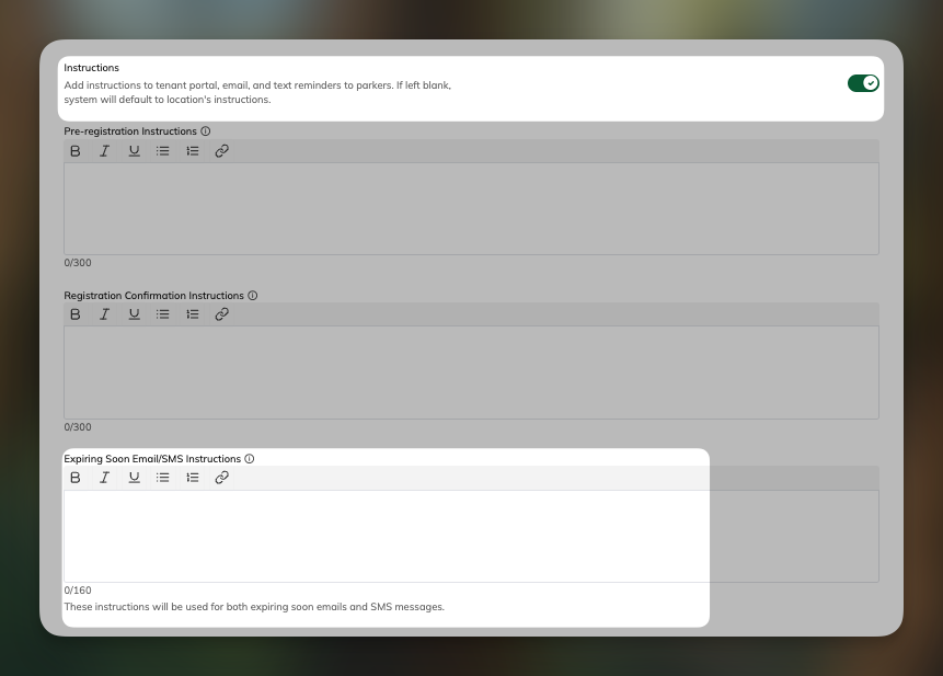- Enable Add Instructions and enter your message under Expiring Soon Email Instructions (≤160 characters, links allowed).
