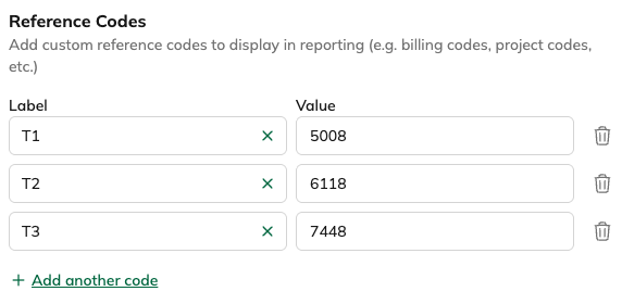 Reference Codes allow you to store several billing-related values (for example, Dept #, Fund #, Account #, Grant #) as separate, labeled fields. Each label becomes its own column in reports - giving admin and finance teams clean, structured data to work with.
