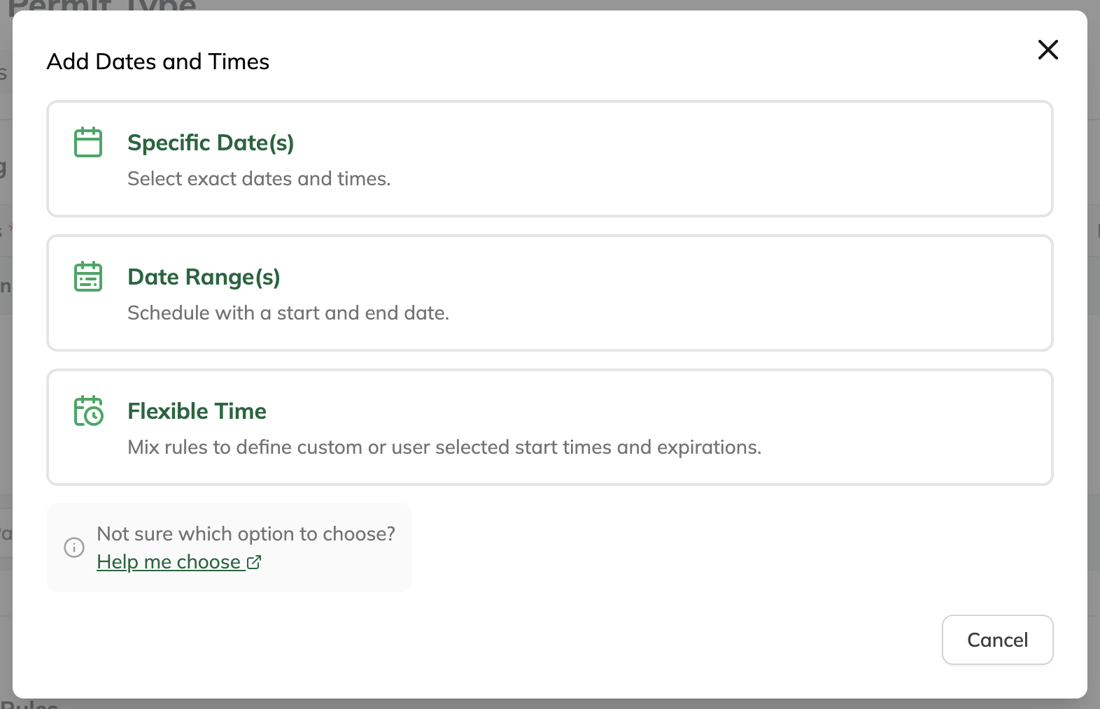 - Use Flexible Time when timing is based on rules or user selection, especially for ongoing or repeatable use cases like hourly or day permits