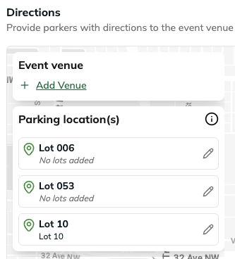 In the Directions tab, add the event venue and review the parking locations on the map.